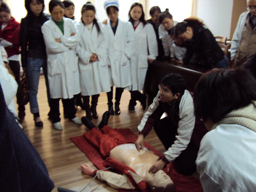 校医院副院长何天香同志专门对医院全体医护人员进行心肺复苏知识培训和模拟人现场训练示范演习。要求医院每个医护人员都要熟练掌握心肺复苏急救知识,为了能做示范和演示正确有效,校医院买了一台心肺复苏模拟人供大家培训学习、演练。下一步医护人员还要开展心肺复苏现场演练竞赛活动,要求医护人人达标。