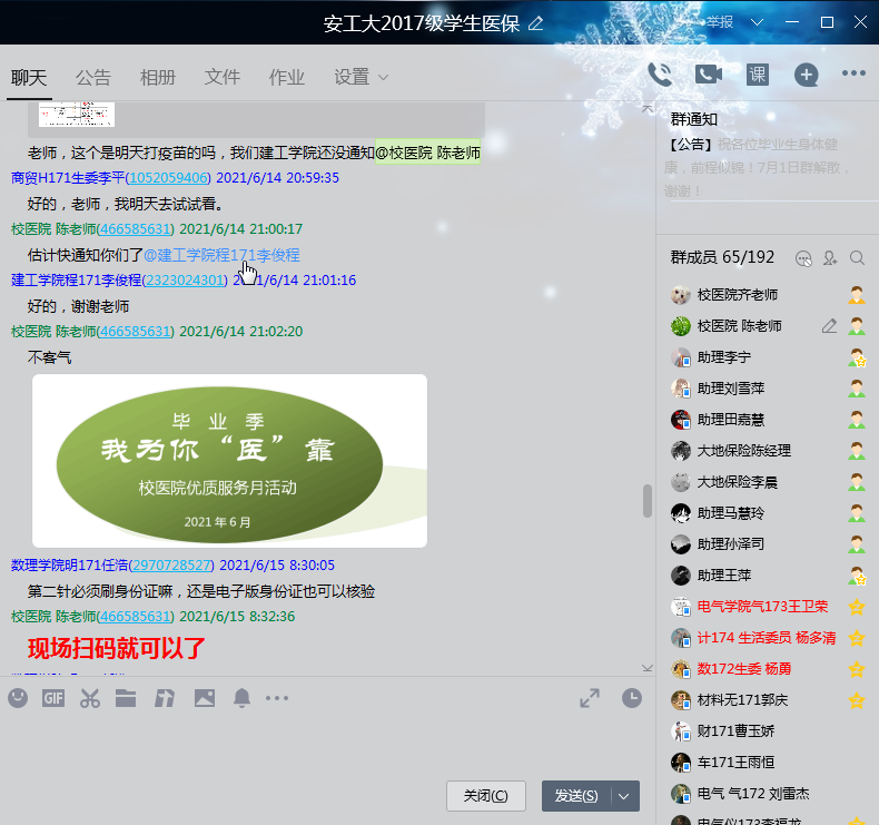 六月,日渐丰盈的季节,按照学校毕业生离校相关通知精神,校医院党支部组织党员针对毕业生体检、门诊医药费报销、医疗服务等积极开展线上线下服务,在线上通过联系学生的QQ群,24小时不打烊,及时解答回复毕业生各类咨询,线下党员干部在各类医疗服务窗口带头作为,示范引领,做到处理问题“一手清”、回答问题“一口清”,带动职工群众积极作为,使校医院的服务更有温度,受到广大毕业生的赞许,诠释了“厚德、精医、博爱、奉献”的服务理念。